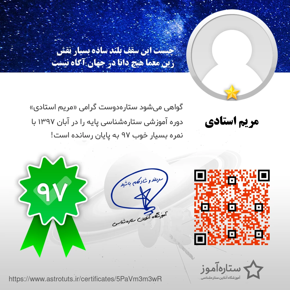 گواهی میشود ستارهدوست گرامی «مریم استادی» دوره آموزشی ستارهشناسی پایه را در آبان ۱۳۹۷ با نمره بسیار خوب ۹۷ به پایان رسانده است!