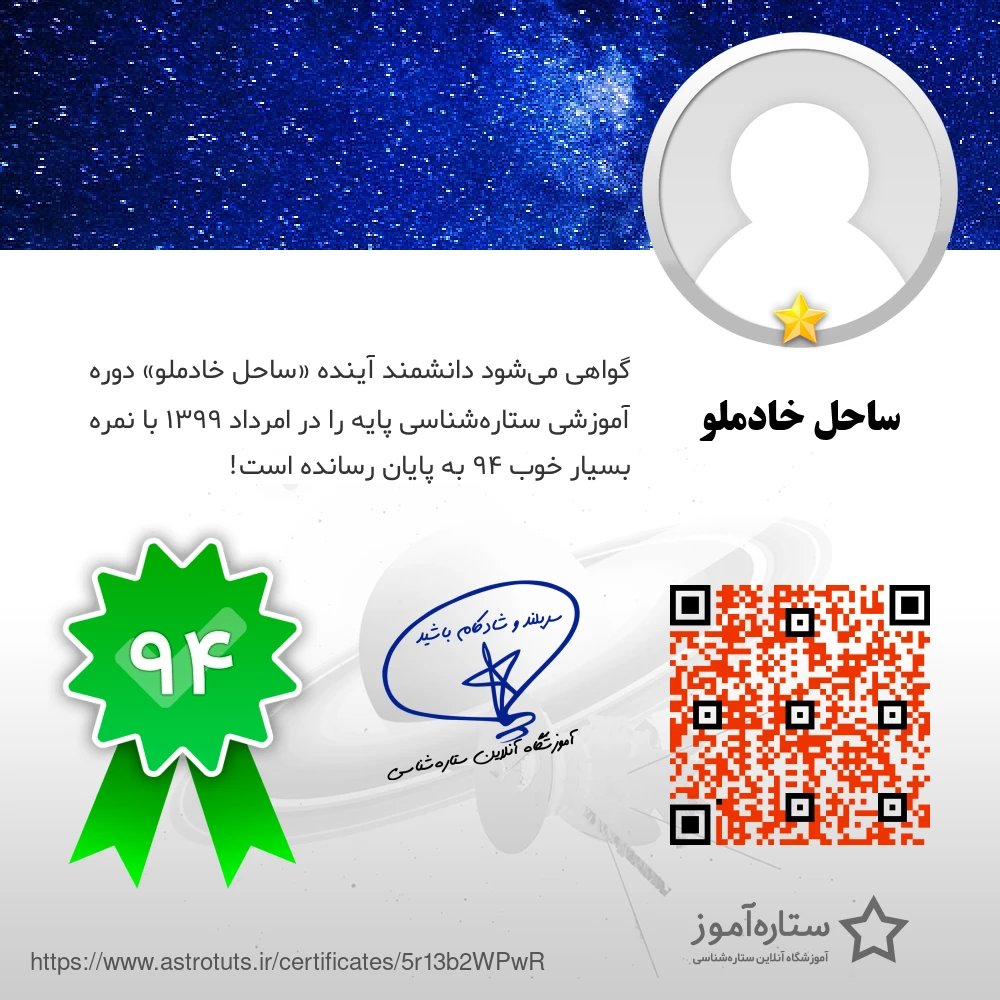 گواهی میشود دانشمند آینده «ساحل خادملو» دوره آموزشی ستارهشناسی پایه را در امرداد ۱۳۹۹ با نمره بسیار خوب ۹۴ به پایان رسانده است!
