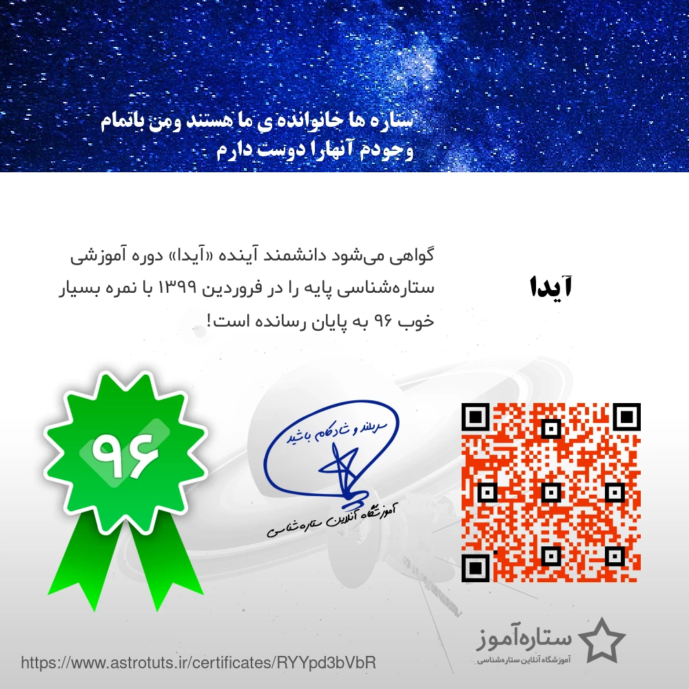 گواهی می‌شود دانشمند آینده «آیدا» دوره آموزشی ستاره‌شناسی پایه را در فروردین ۱۳۹۹ با نمره بسیار خوب ۹۶ به پایان رسانده است!