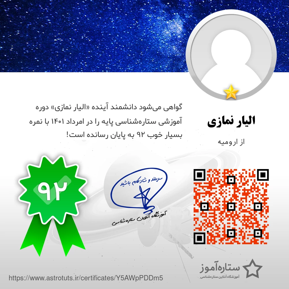گواهی میشود دانشمند آینده «الیار نمازی» دوره آموزشی ستارهشناسی پایه را در امرداد ۱۴۰۱ با نمره بسیار خوب ۹۲ به پایان رسانده است!
