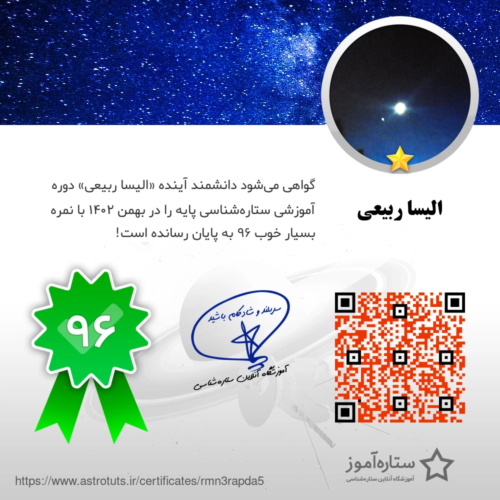 گواهی میشود دانشمند آینده «الیسا ربیعی» دوره آموزشی ستارهشناسی پایه را در بهمن ۱۴۰۲ با نمره بسیار خوب ۹۶ به پایان رسانده است!