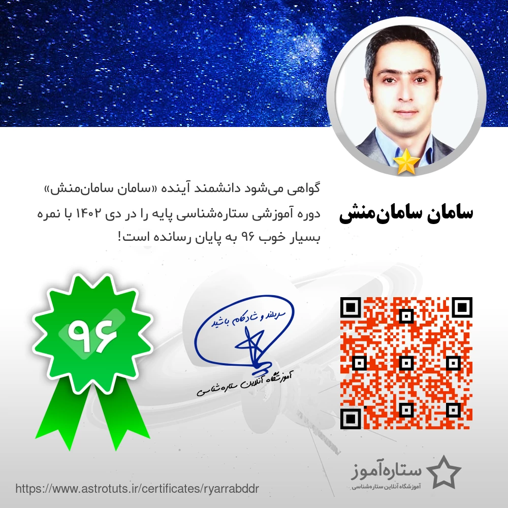 گواهی میشود دانشمند آینده «سامان سامانمنش» دوره آموزشی ستارهشناسی پایه را در دى ۱۴۰۲ با نمره بسیار خوب ۹۶ به پایان رسانده است!